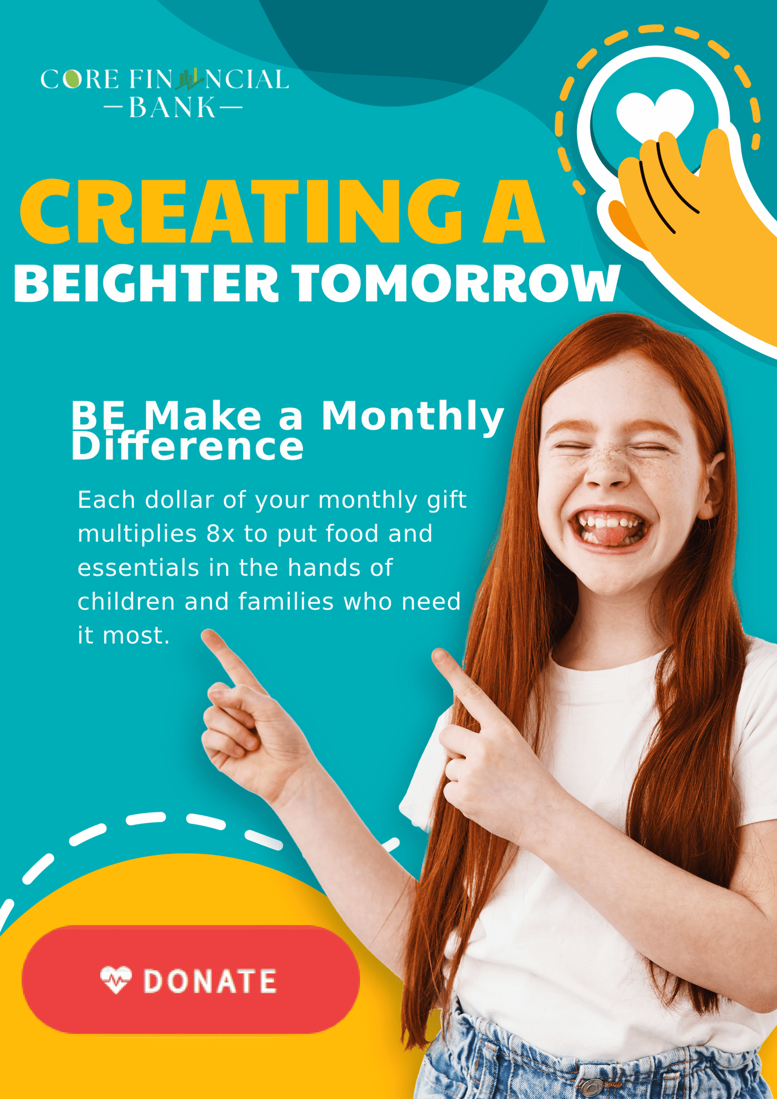 All children deserve to live safe and healthy lives. Your 100 percent tax-deductible donation to Core Financial Bank Fundation helps uphold that right by helping to provide the most vulnerable children with the essentials every child needs — nutrition, water, protection, education, health care — to survive and thrive.